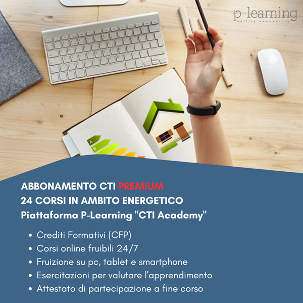 l CTI, tramite la piattaforma P-learning "CTI Academy", offre la possibilità di attivare un abbonamento che consente di seguire 24 corsi online in continuo aggiornamento. L'abbonamento premium comprende il corso da 80 ore per Certificatore Energetico degli edifici - Linee Guida Nazionali. I corsi, fruibili 24 ore al giorno e 7 giorni su 7, prevedono il rilascio di Crediti Formativi Professionali (CFP) per Ingegneri, Geometri e Periti Industriali. Sono previste delle esercitazioni e dei quiz per valutare l'apprendimento e a fine corso verrà rilasciato l'attestato di partecipazione.Cliccando su 'ACQUISTA CORSO' verrai indirizzato al sito www.p-learning.com dove potrai ricevere maggiori informazioni sui CFP rilasciati e procedere con l’acquisto. Successivamente riceverai via mail un link e delle credenziali d’accesso che ti permetteranno di entrare in un’area riservata dove potrai procedere in autonomia all’attivazione delle licenze.L'elenco dei corsi compresi nell'abbonamento premium sono: